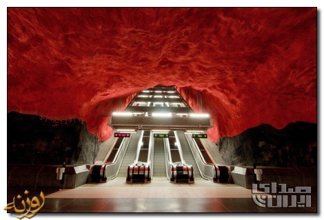 در نگاه اول به نظر می رسد که جهنم به زمین آمده و یک پله برقی از درون آن به زمین احداث شده است! اما در حقیقت عکس پایین یکی از تقریباً صد ایستگاه زیرزمینی در استوکهولم سوئد است که در آن سقف و دیوار ها صخره های طبیعی بوده و نیمه کاره رنگ شده است.