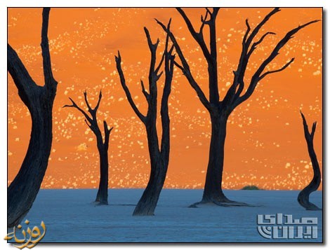در نگاه اول قاطعانه می گویید که با یک تصویر کارتونی یا یک نقاشی زیبا طرف هستید اما از شما می خواهیم که دقیق تر نگاه کنید. اگر به تنه درختان و زمین نگاه کنید می توانید خودتان را قانع کنید که تصویر متعلق به تعدادی درخت خشک در زمینی برفی هستند اما پس زمینه نارنجی به هیچ وجه عاقلانه به نظر نمی رسد. پس زمینه مشخصاً آسمان نیست اما به گفته National Geographic پس زمینه نارنجی یک تپه شنی است که لکه های سفید رنگ خارهای خشک بر سطح آن هستند و رنگ نارنجی تند آن به سبب زمان غروب خورشید است و زمینی که برفی به نظر می رسد در حقیقت شنی است به سبب سایه به این رنگ درآمده است.