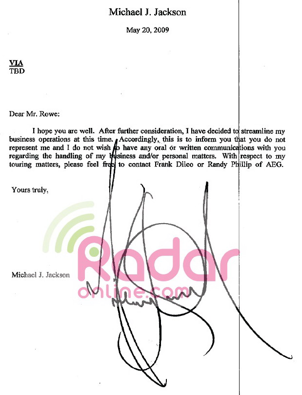 روز گذشته نامه ای رسمی با امضای مایکل جکسون انتشار یافت که در آن قید شده بود مایکل هیچگونه ی رابطه ی کاری با لئونارد رو ندارد و او حق نمایندگی و دخالت در امور وی را نخواهد داشت. مایکل همچنین نوشته است که تمایلی ندارد پیرامون مسائل کاری یا شخصی اش با لئونارد رو ارتباط کلامی و یا نوشتاری داشته باشد.